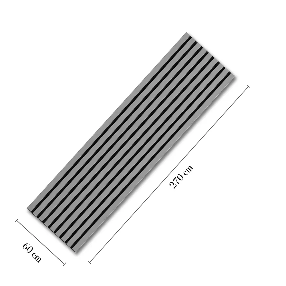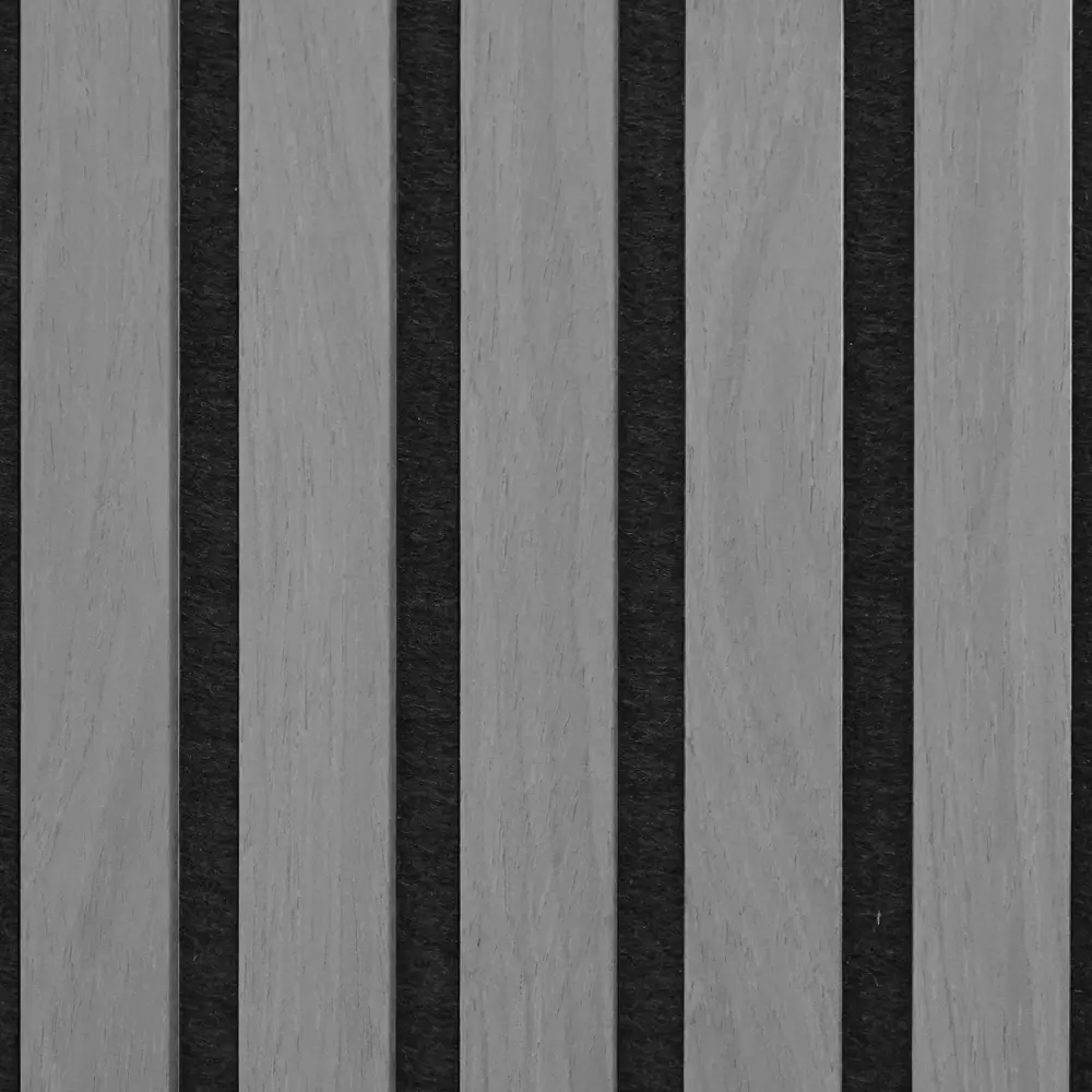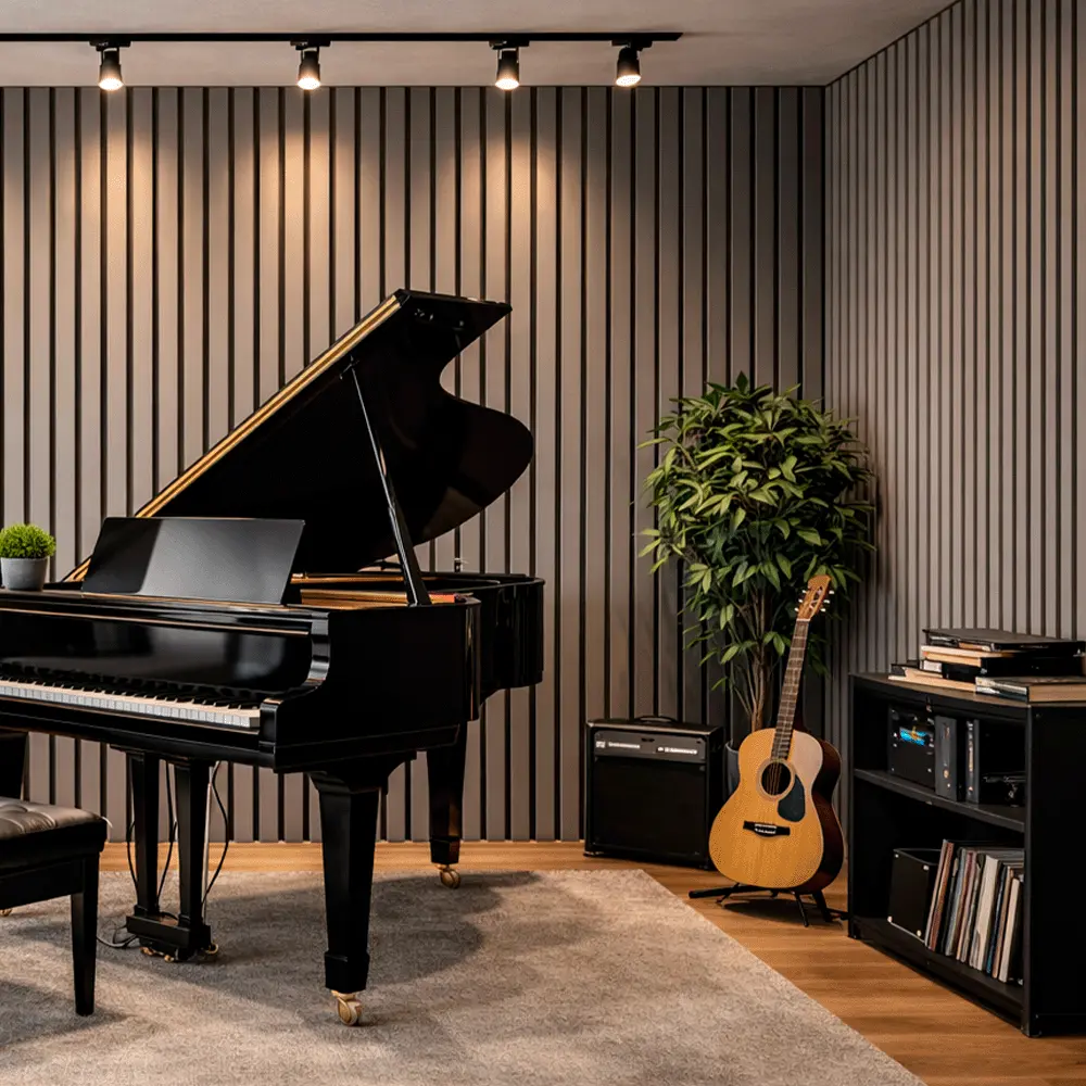 Recubrimiento decorativo que mejora la acústica interior al reducir eco, reverberación y ruido ambiental. Su sistema combina listones de MDF con acabado tipo madera y fieltro acústico de alta densidad, logrando una absorción sonora efectiva y un acabado moderno.