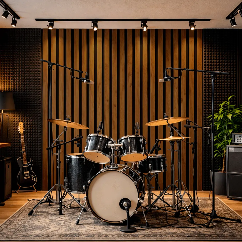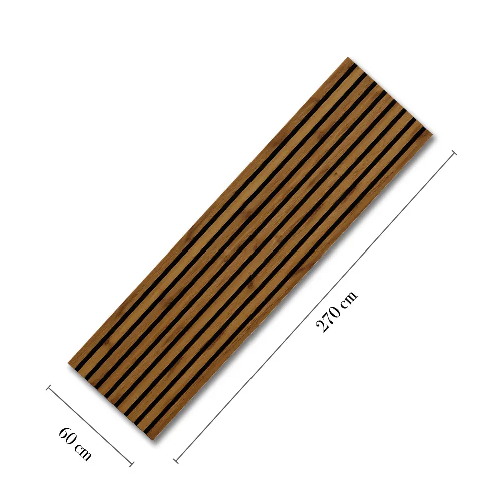 Recubrimiento decorativo que mejora la acústica interior al reducir eco, reverberación y ruido ambiental. Su sistema combina listones de MDF con acabado tipo madera y fieltro acústico de alta densidad, logrando una absorción sonora efectiva y un acabado moderno.