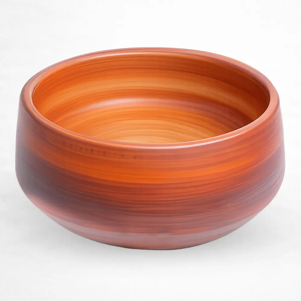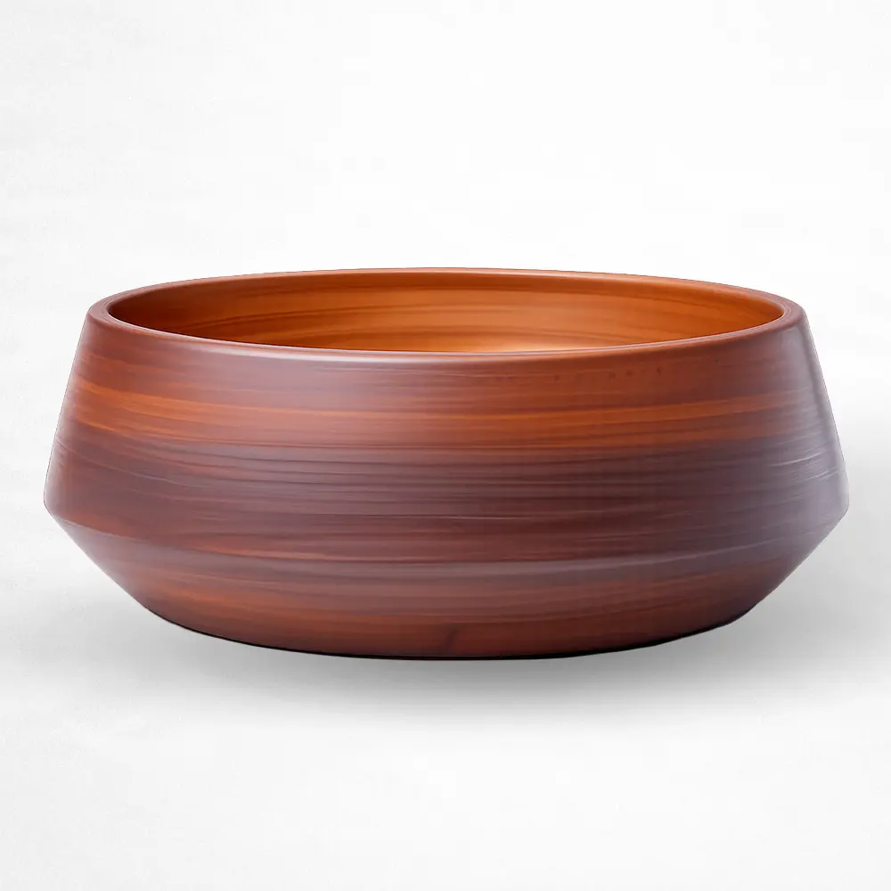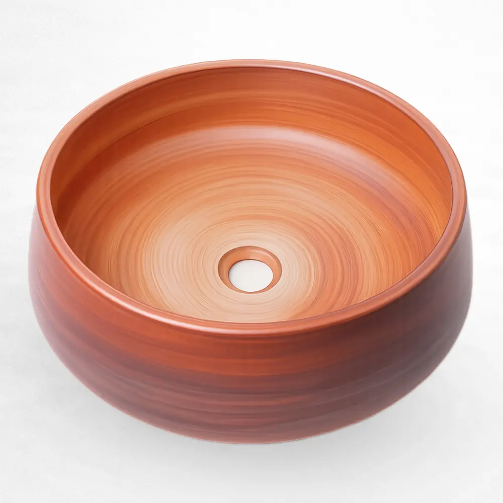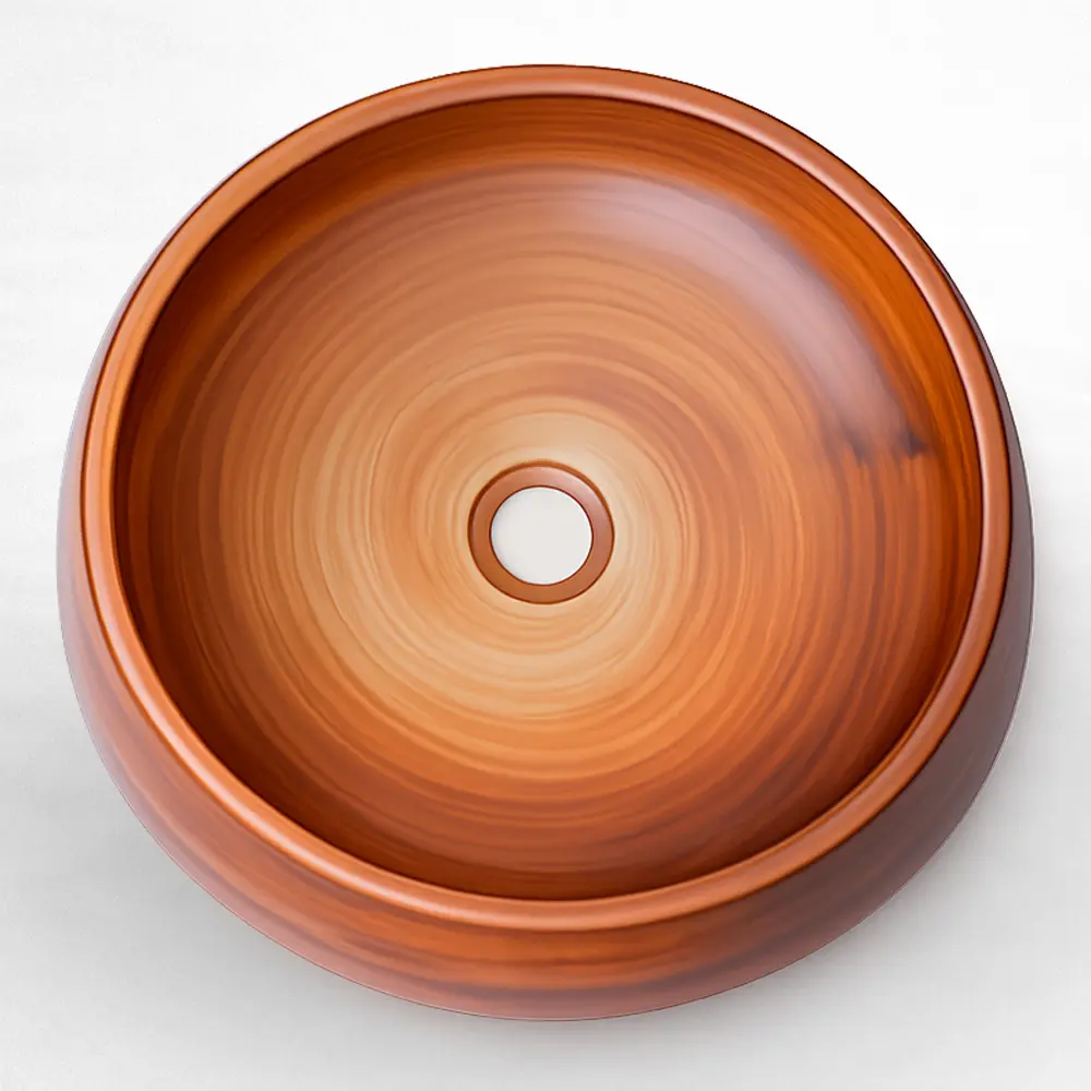 Lavabo de sobreponer con diseño tipo tazón de gran volumen, fabricado en cerámica resistente con acabado en alto brillo y apariencia tipo madera. Su forma redondeada y paredes robustas aportan calidez y un estilo distintivo, ideal para baños residenciales o comerciales que buscan una pieza decorativa. Incluye orificio de drenaje estándar y ofrece una superficie durable y de fácil mantenimiento.