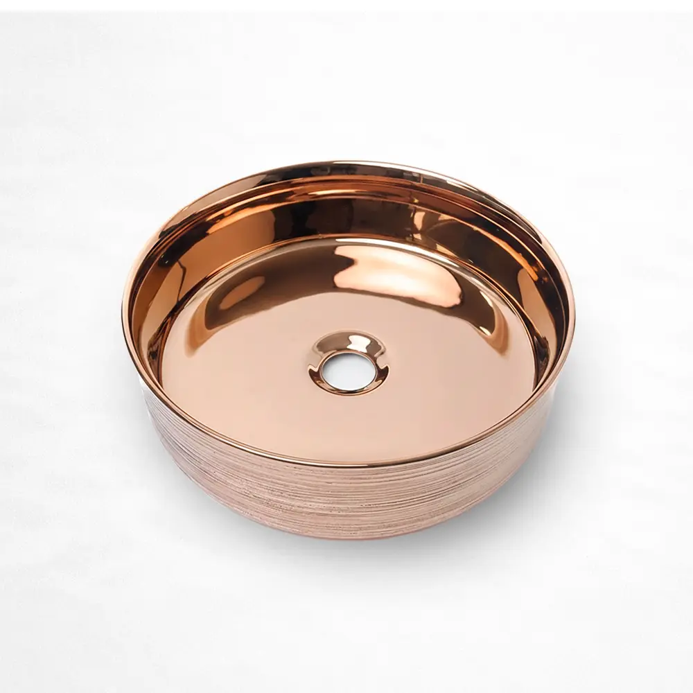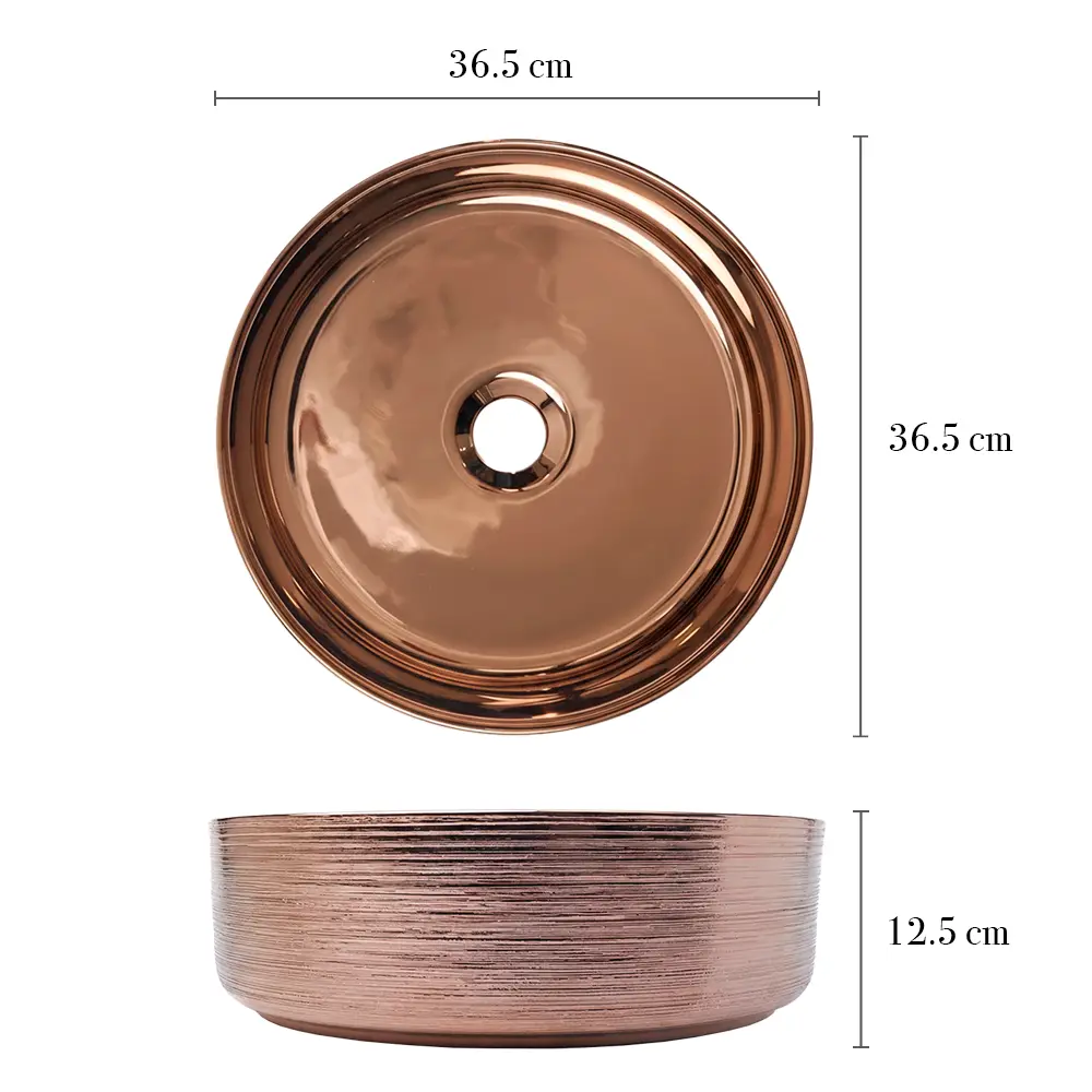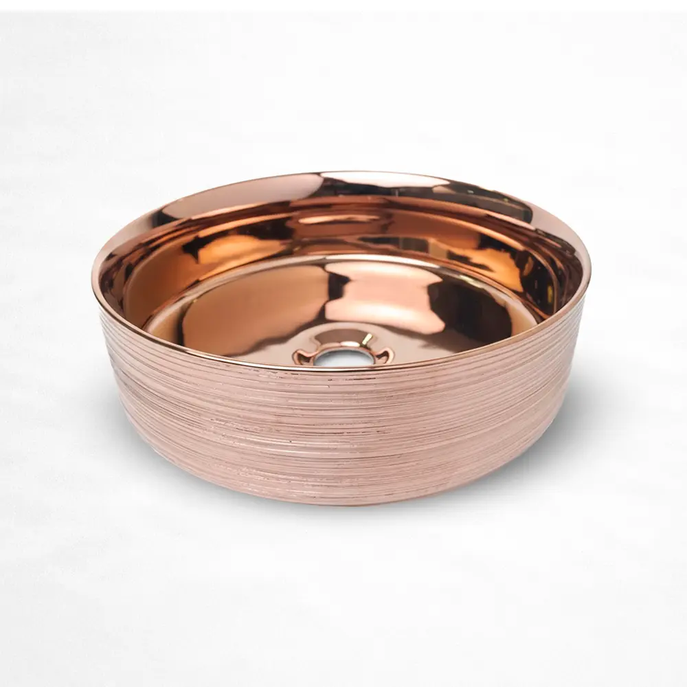Lavabo de sobreponer con diseño cilíndro bajo, fabricado en cerámica resistente y acabado metálico cobre con textura exterior en líneas horizontales. Su forma profunda y líneas redondeadas aportan un estilo moderno y elegante, ideal para baños residenciales o comerciales que buscan una pieza decorativa. Incluye orificio de drenaje estándar y ofrece una superficie durable y fácil de mantener, perfecta para integrarse en espacios contemporáneos o de inspiración premium.