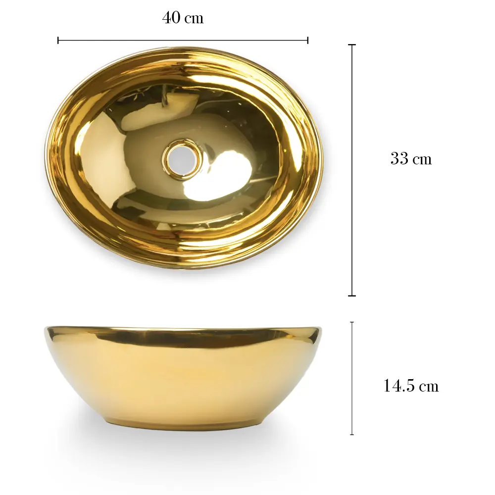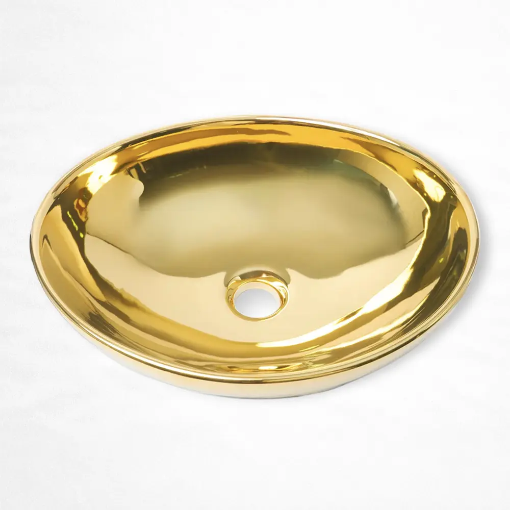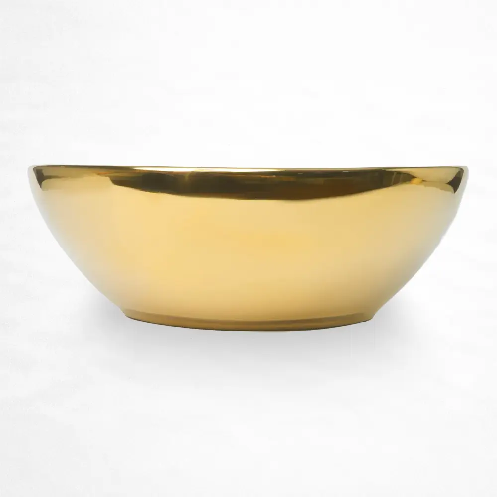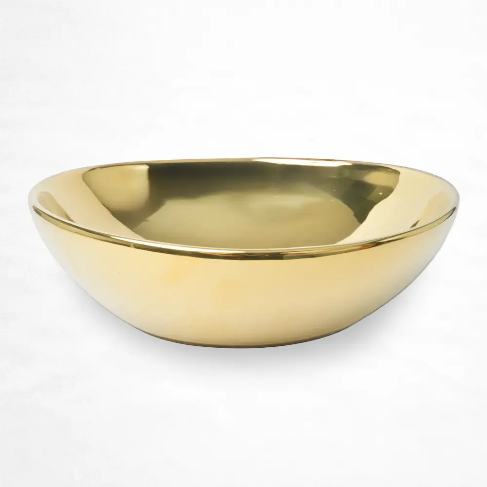 Lavabo de sobreponer con diseño tipo tazón, fabricado en cerámica resistente y acabado metálico plateado. Su forma profunda y líneas redondeadas aportan una estética moderna y sofisticada, ideal para baños residenciales o comerciales que buscan una pieza protagonista. Incluye orificio de drenaje estándar y ofrece una superficie durable y fácil de mantener, perfecta para integrarse en espacios contemporáneos o de inspiración premium.