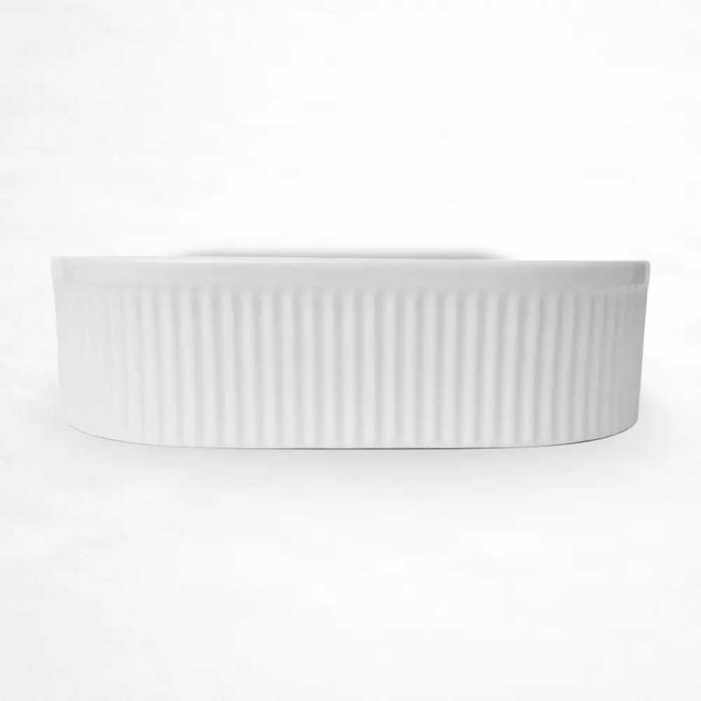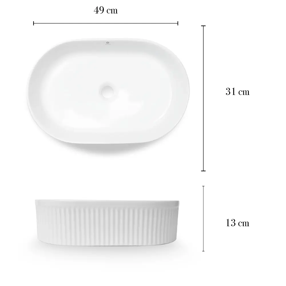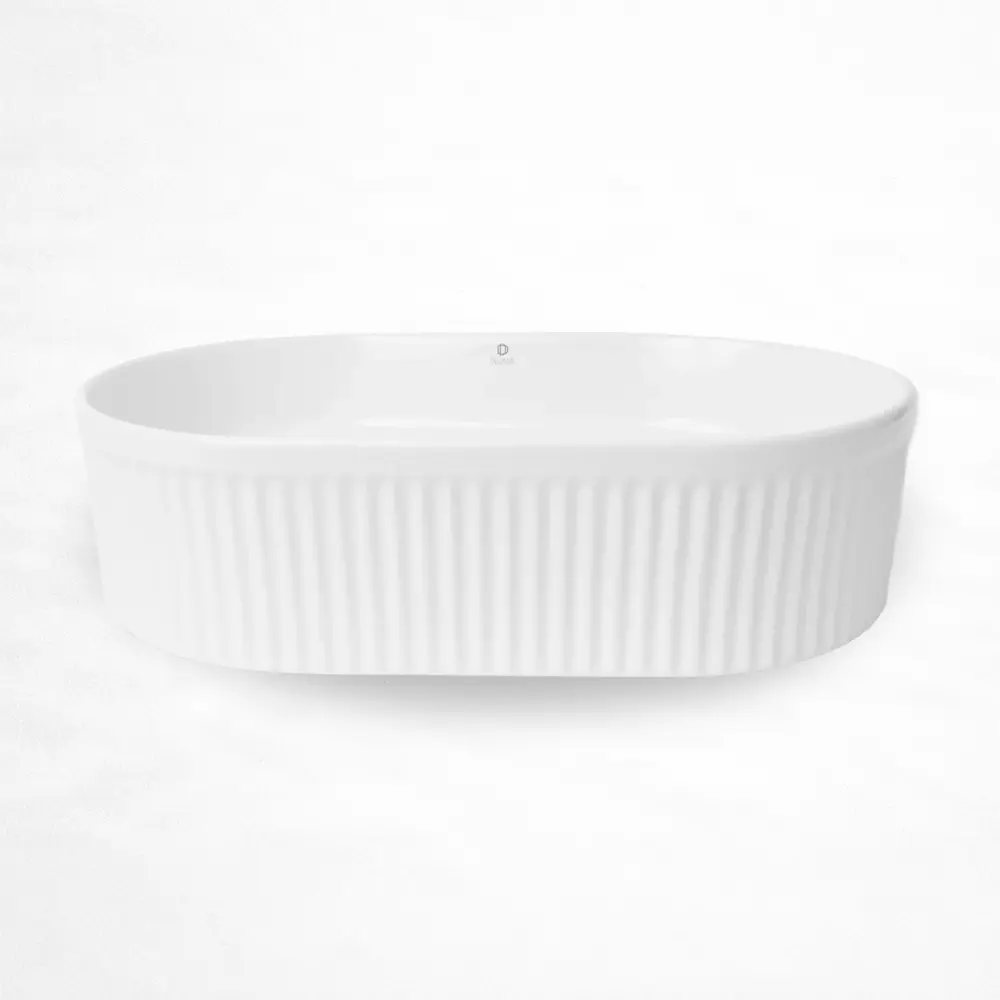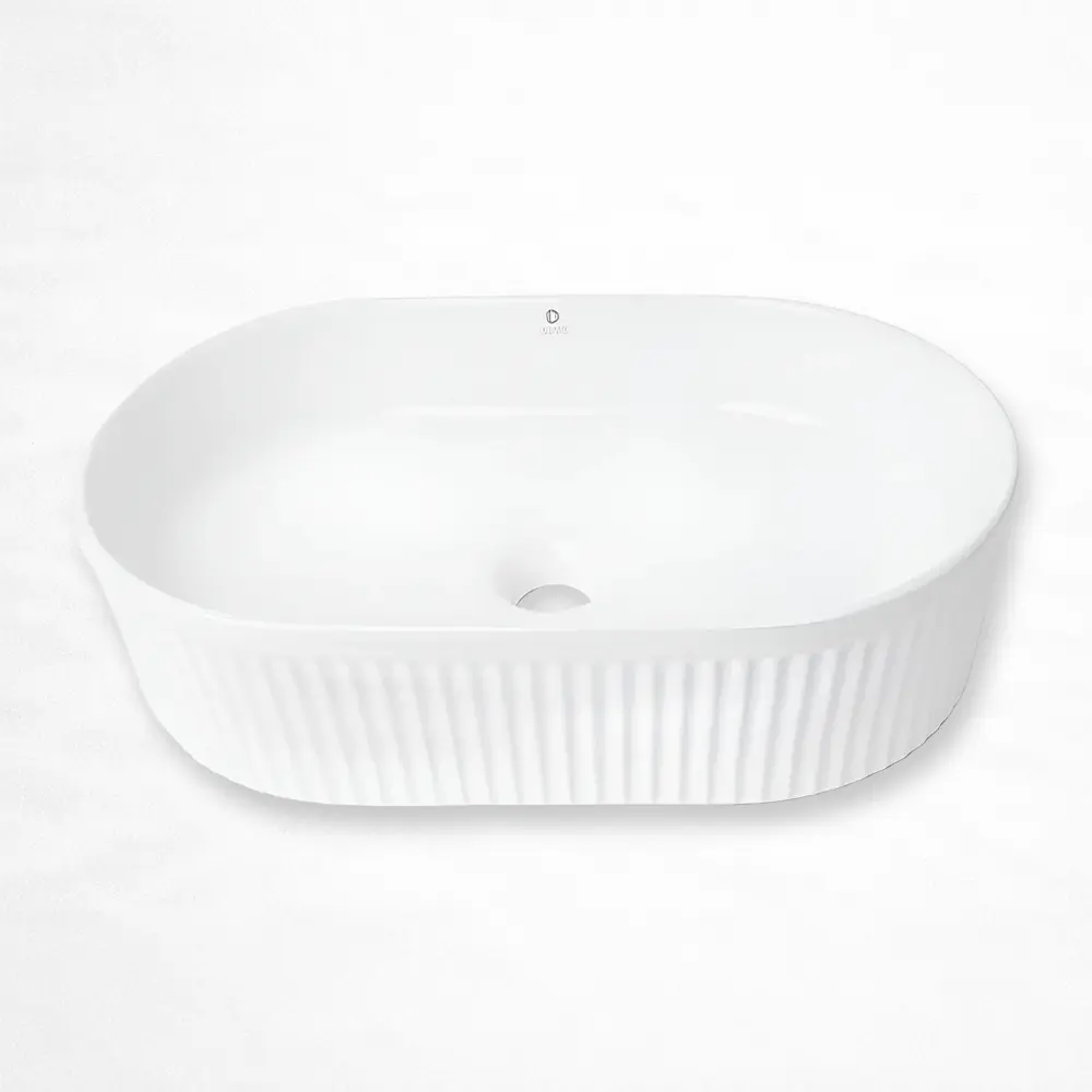 Lavabo de sobreponer con diseño ovalado, fabricado en cerámica resistente y acabado blanco en alto brillo. Su exterior presenta una textura acanalada vertical que aporta carácter y un detalle decorativo sutil, mientras que su interior de líneas suaves ofrece una estética limpia y moderna. Ideal para baños residenciales o comerciales, incluye orificio de drenaje estándar y una superficie durable y de fácil mantenimiento, perfecta para integrarse en espacios contemporáneos.