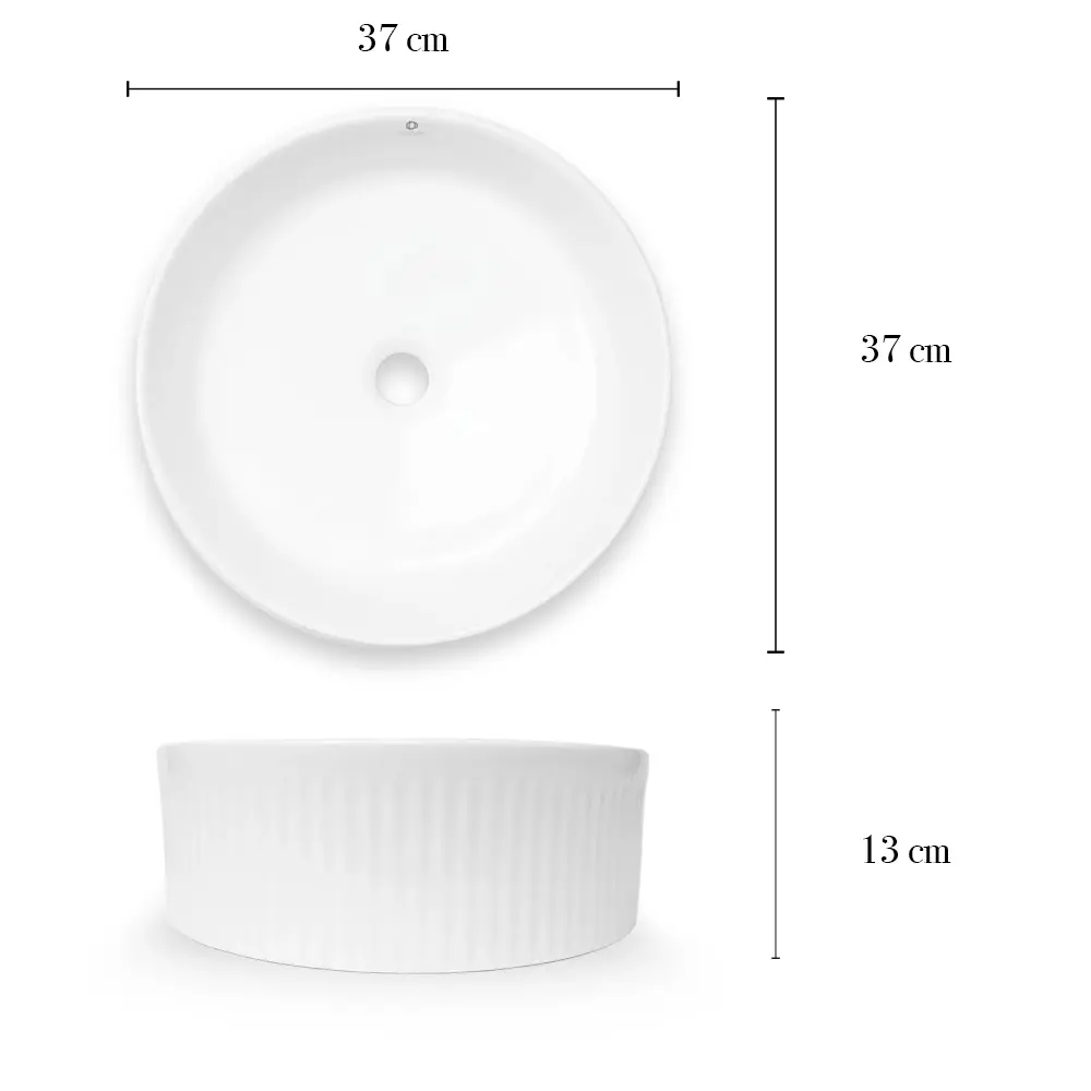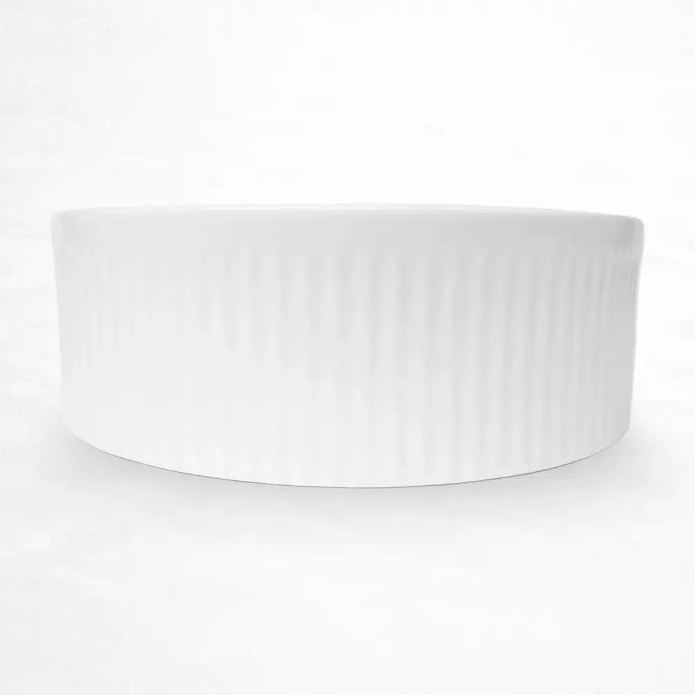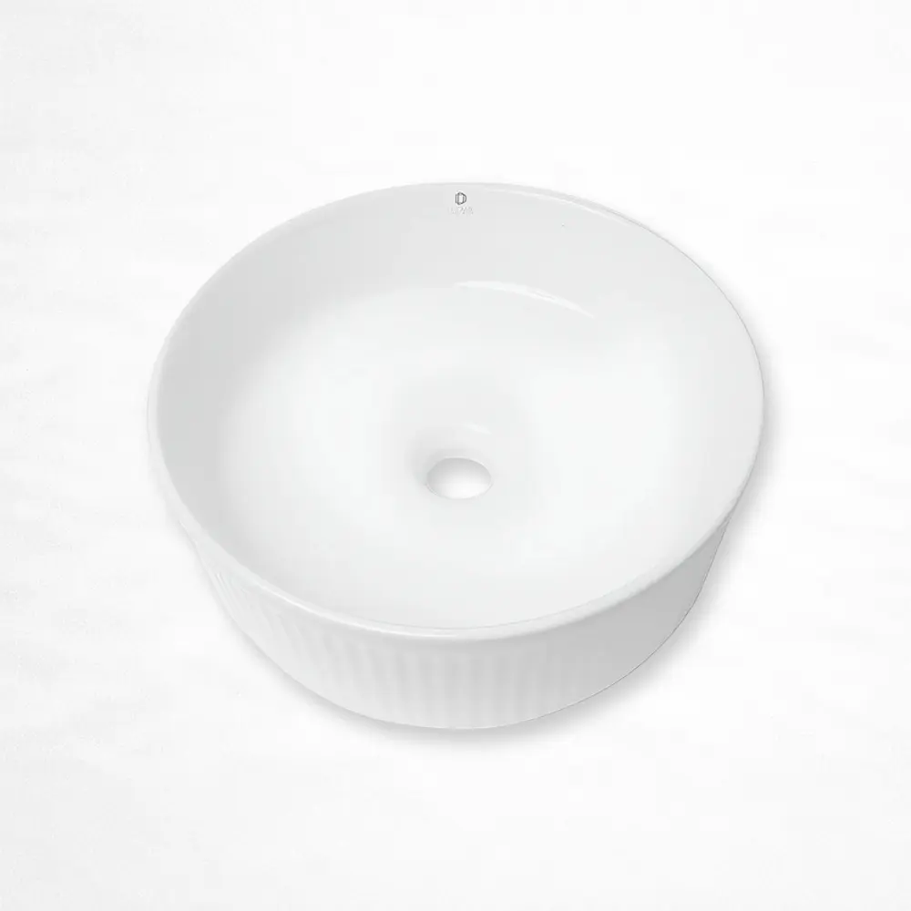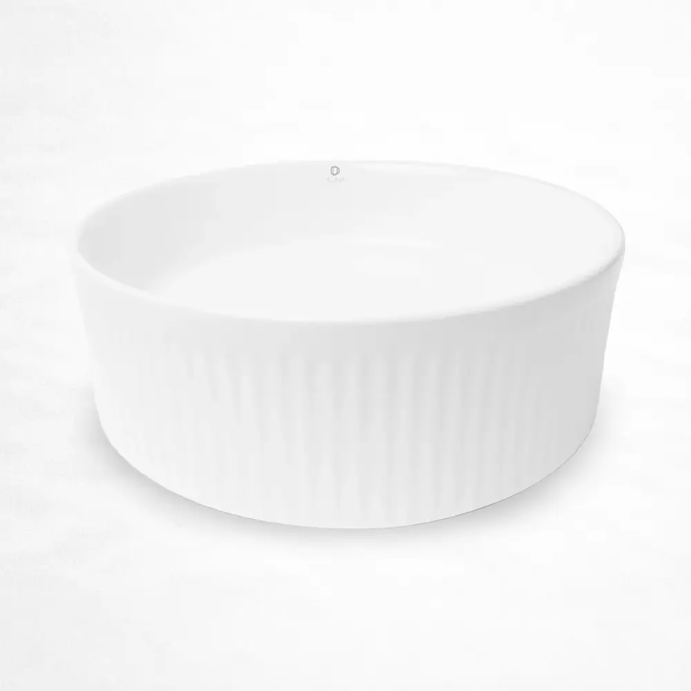 Lavabo de sobreponer con diseño cilíndro alto, fabricado en cerámica resistente y acabado blanco en alto brillo. Su exterior presenta una textura acanalada vertical que aporta un detalle decorativo sutil, mientras que el interior de líneas suaves ofrece una estética limpia y contemporánea. Ideal para baños residenciales o comerciales, incluye orificio de drenaje estándar y una superficie durable y de fácil mantenimiento.