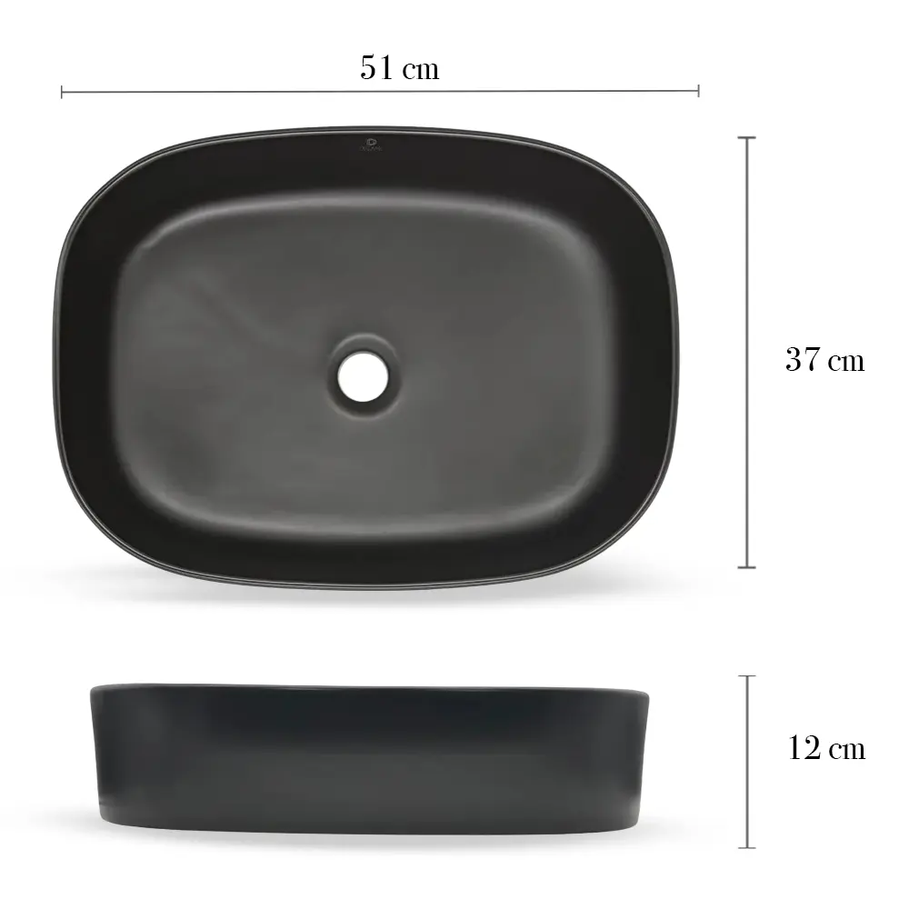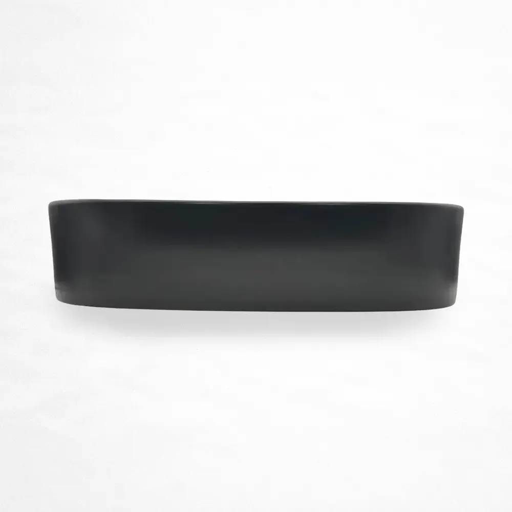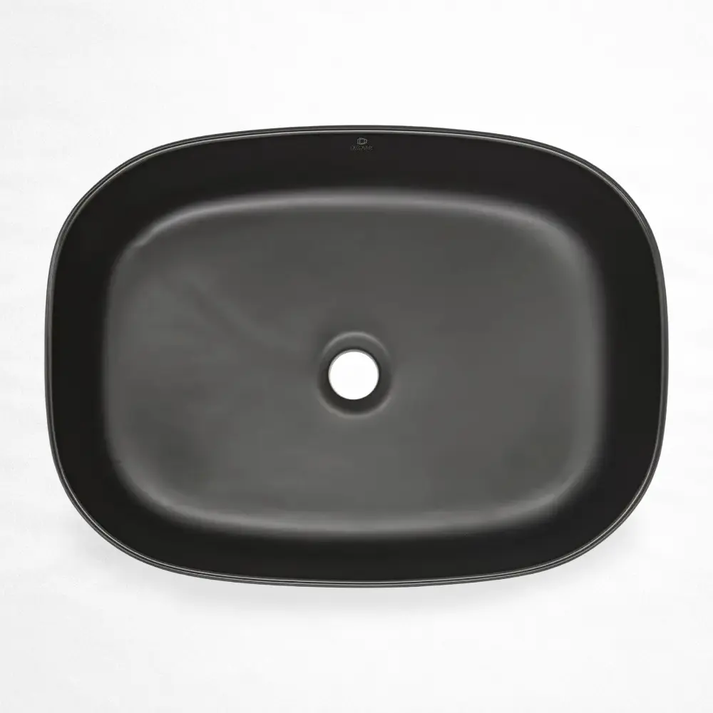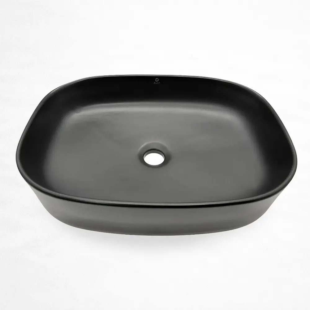 Lavabo de sobreponer con diseño rectangular de esquinas redondeadas, fabricado en cerámica resistente y acabado negro mate. Su forma amplia y bordes suavizados aportan una estética contemporánea y sofisticada, ideal para baños residenciales o comerciales de estilo moderno. Incluye orificio de drenaje estándar y ofrece una superficie durable y de fácil mantenimiento, perfecta para crear un contraste elegante y sobrio en el espacio.