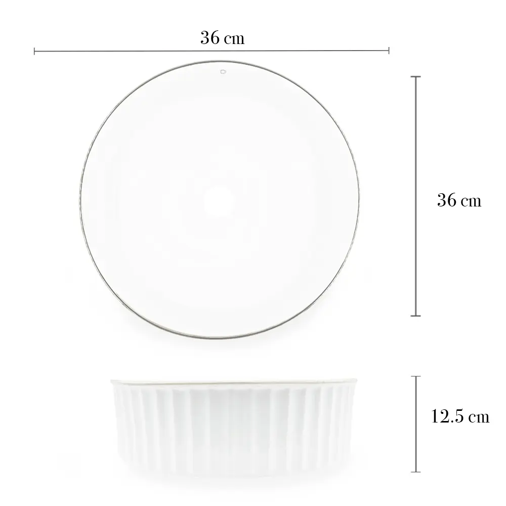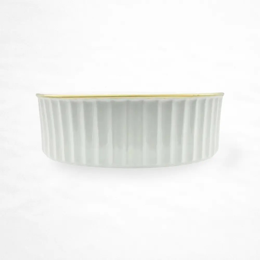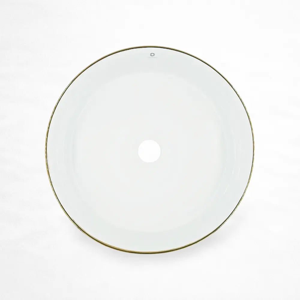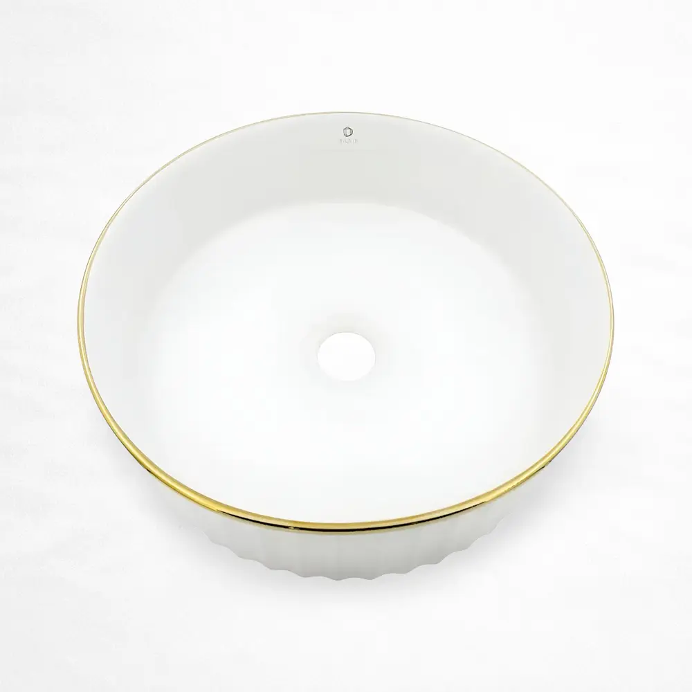 Lavabo de sobreponer con diseño de cilíndro alto, fabricado en cerámica resistente y acabado blanco en alto brillo con borde perimetral en tono dorado. Su exterior con textura acanalada vertical aporta un detalle decorativo elegante, mientras que el interior de líneas suaves refuerza una estética refinada y contemporánea. Ideal para baños residenciales o comerciales de inspiración premium, incluye orificio de drenaje estándar y ofrece una superficie durable y de fácil mantenimiento.