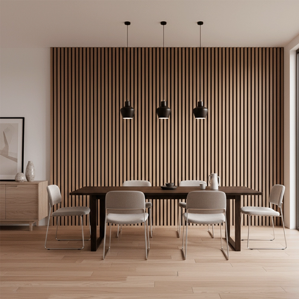 El lambrín interior de WPC es un recubrimiento decorativo para muros y plafones que combina fibras de madera y polímeros para ofrecer apariencia tipo madera, alta resistencia, estabilidad dimensional y bajo mantenimiento. Su diseño aporta calidez y textura a espacios residenciales y comerciales, y puede instalarse con adhesivo, tornillería oculta o sistema de clips según el modelo. Es resistente a la humedad ambiental, no se deforma y funciona idealmente en muros interiores, plafones, recepciones, cabeceras y oficinas, siempre en superficies firmes y secas y exclusivamente para uso interior.